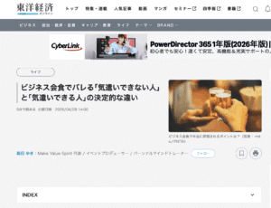 東洋経済オンラインに「ビジネス会食でバレる「気遣いできない人」と「気遣いできる人」の決定的な違い」掲載されました!メディア実績 / By 森田ゆき 東洋経済オンラインにて 「外資系秘書が教えるうまい気遣いもったいない気遣い」より ========== ビジネス会食でバレる「気遣いできない人」と「気遣いできる人」の決定的な違い ========== が、記事掲載されました! 詳細はこちらです。 ぜひチェックしてみてください。 公開URL: https://toyokeizai.net/articles/-/942601